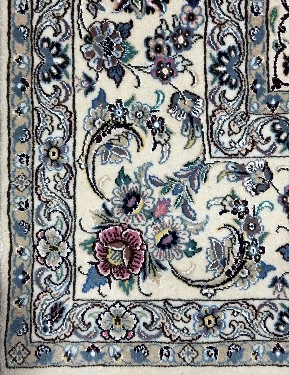 The craftsmanship behind this rug reflects the high standards for which Nain weavers are known. Each knot is tied with exceptional precision, allowing for smooth curves, crisp outlines, and highly detailed motifs. This level of technical skill enables the execution of complex floral patterns with remarkable clarity and balance. The motifs are carefully proportioned and thoughtfully arranged, ensuring that the composition feels cohesive and elegant rather than crowded or heavy.