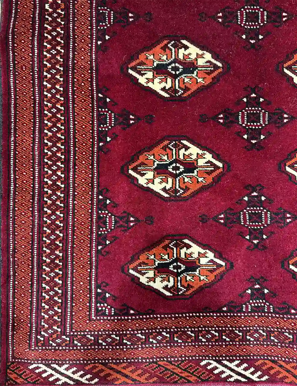 A handwoven Turkmen rug in a rich wine-red shade — one of the most beautiful and distinctive colors in Turkmen weaving.